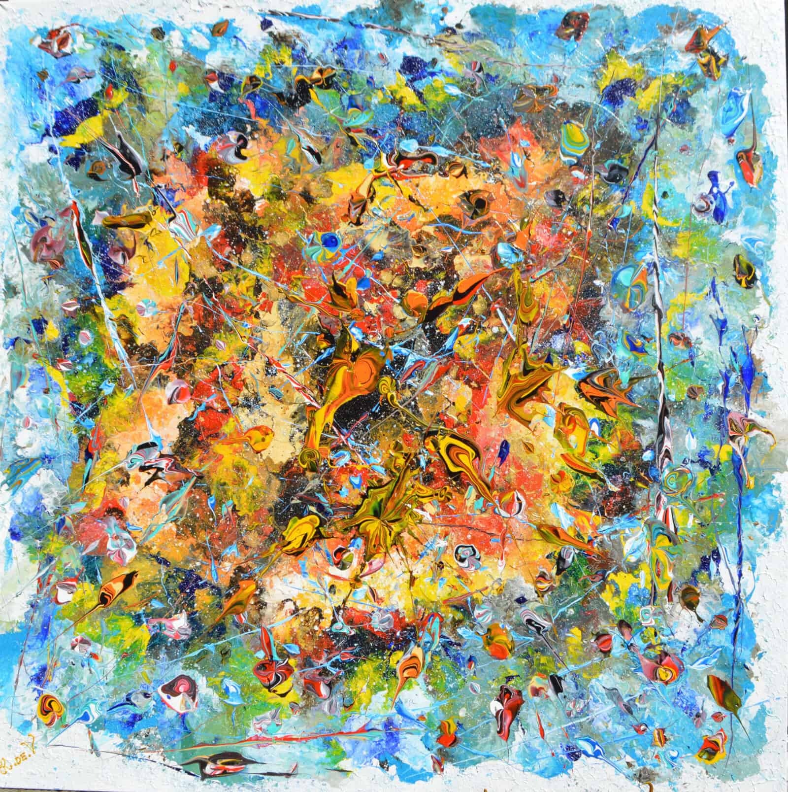 Cosmos is an expansive, galaxy-inspired work that draws the viewer into a world of color. Dynamic swirls of blue, yellow, and red burst outward from the center, layered over a deep, textured ground. The painting feels infinite and radiant, capturing the mystery, motion, and brilliance of the universe.
