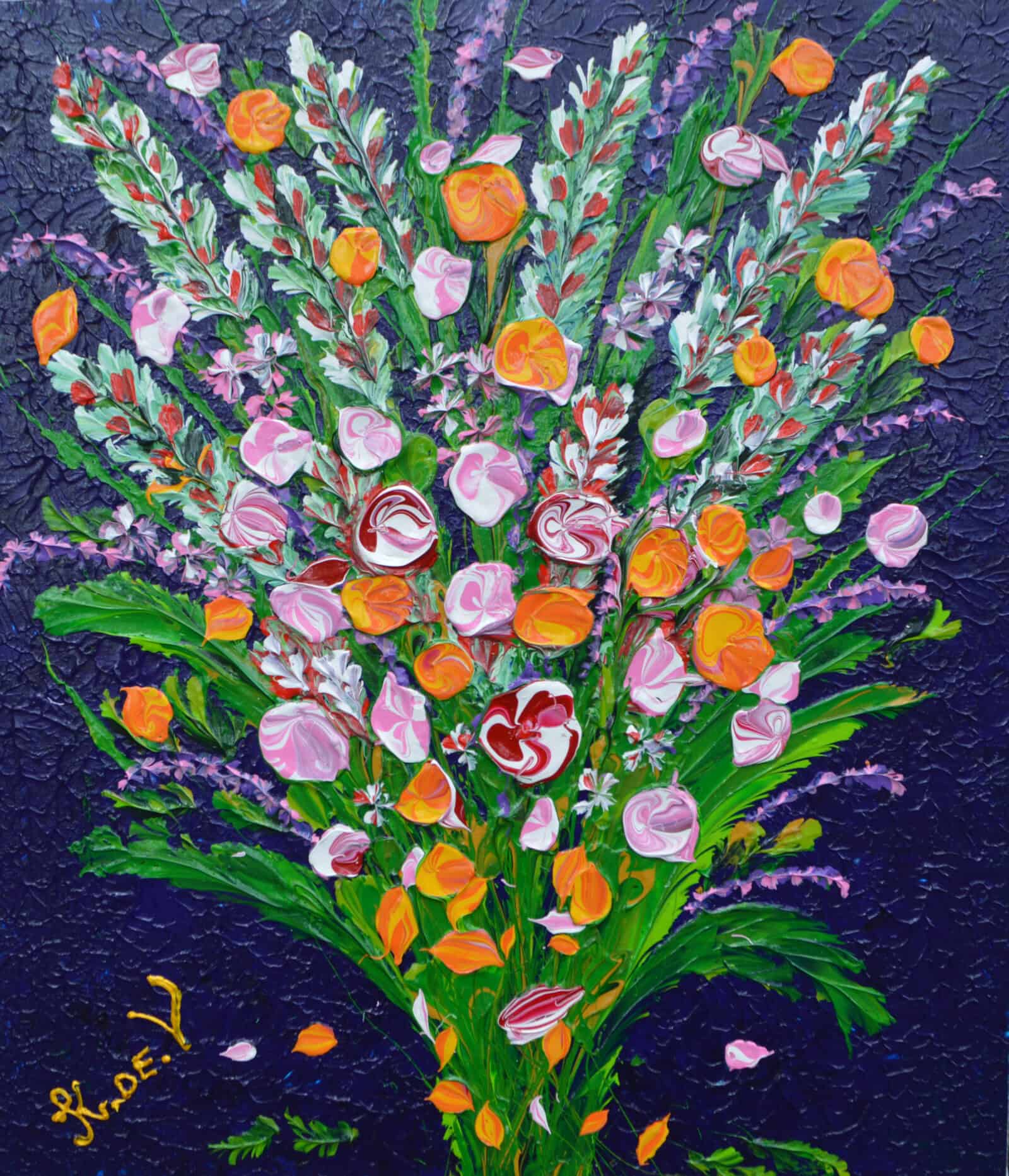A radiant bouquet set against a deep blue background. Vivid blossoms mingle with soft pinks, oranges, and whites, framed by lush greens and airy lavender spikes. The strong contrast and rich texture make the flowers glow, giving the piece a bold, celebratory presence.