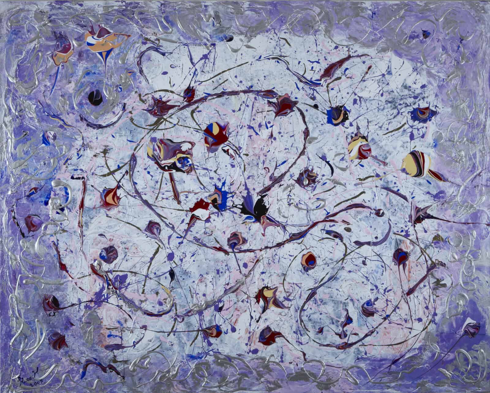 A powerful abstract painting with bold strokes of dark purple and blue swirling across the canvas, layered with silver undertones that add depth and radiance. The composition feels alive — like the surface of a pond in motion, where reflections and light blend into one vibrant whole. Both elegant and bold, the painting radiates freshness and natural abundance.