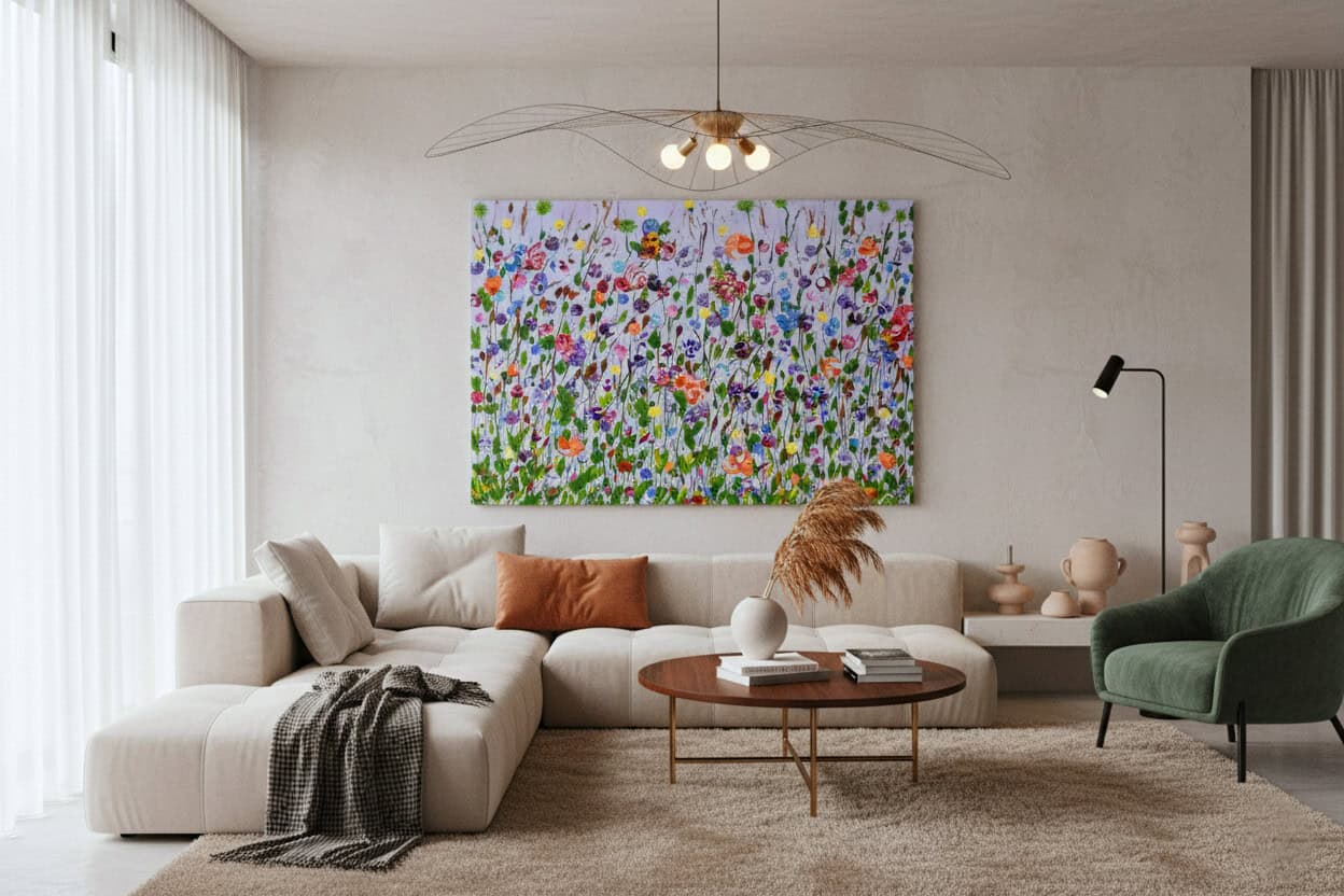 A dreamy meadow in soft lilac tones, where delicate flowers in pinks, purples, oranges, and blues sway gently across the canvas. The pastel background gives this piece a light, ethereal feeling, making it both calming and uplifting at once.