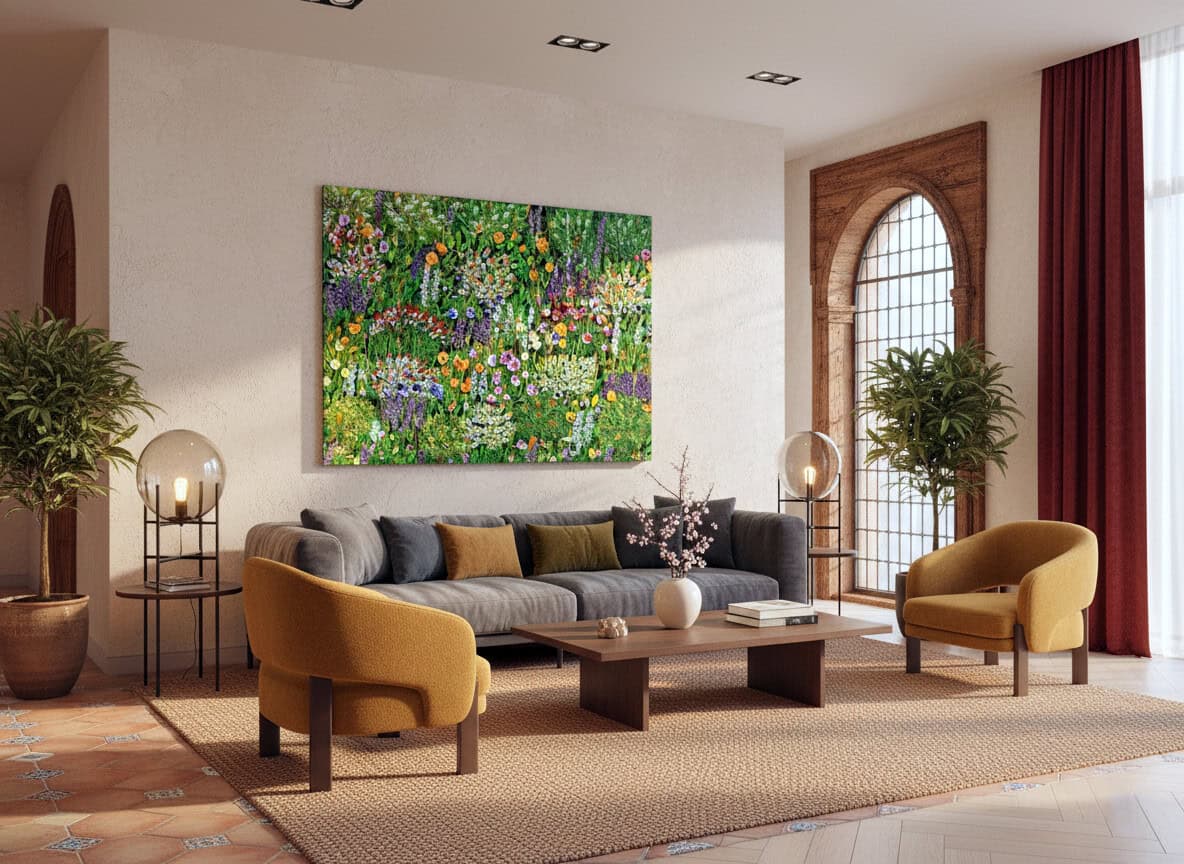 With layered textures and abundant blossoms, Olivia is a flourishing field of wildflowers. Bright whites, yellows, reds, and purples create a rich tapestry of color, evoking the abundance and beauty of late summer gardens.