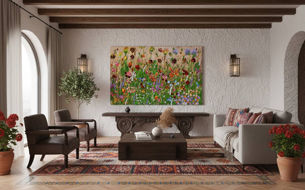 Seren glows with warmth and richness. A golden-beige background sets the stage for fiery reds, oranges, and yellows, balanced by soft blues and purples. This piece radiates energy, like a garden kissed by late-afternoon sunlight.