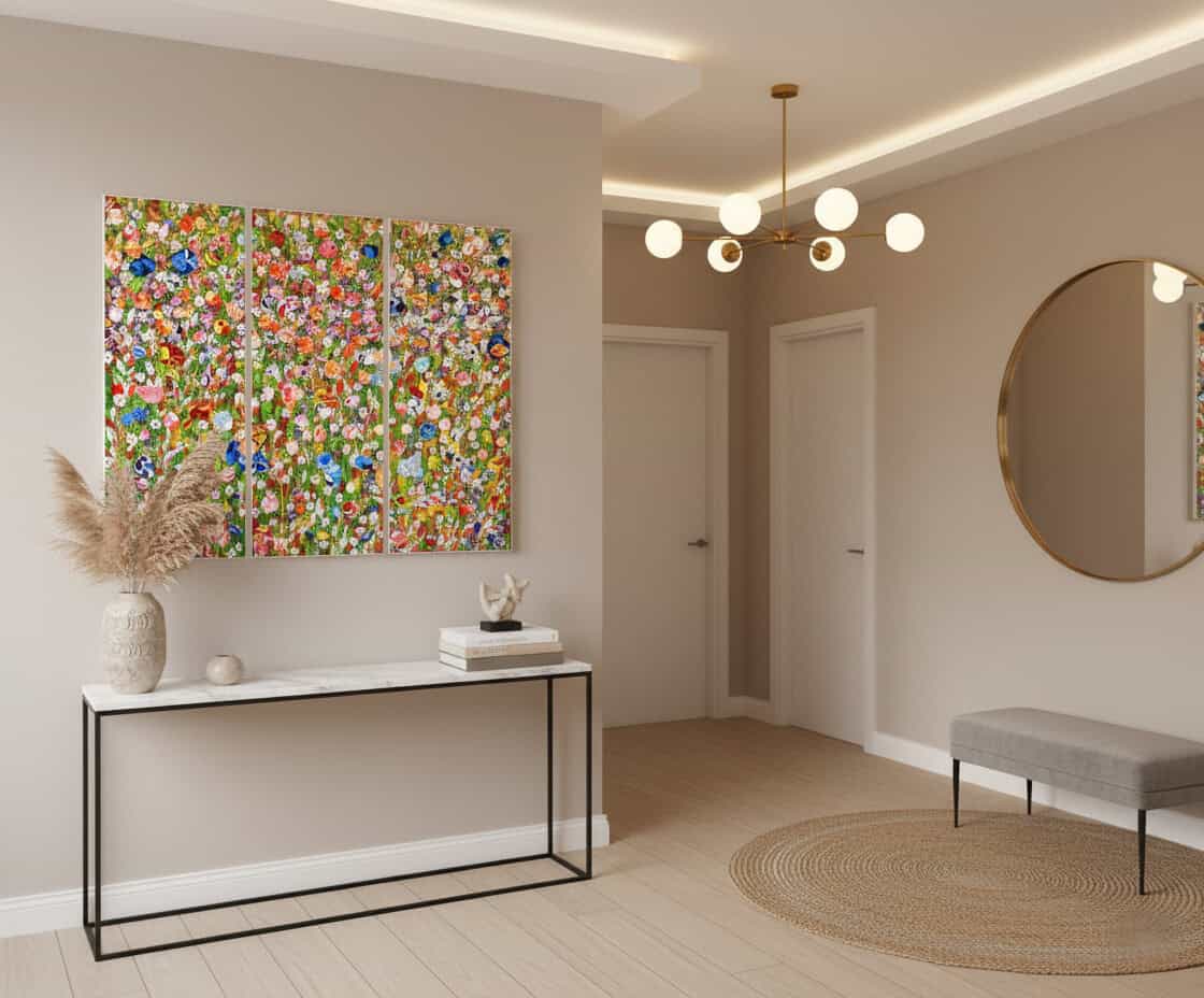 Summer Blues is a three-panel painting that bursts with the energy of a wildflower meadow in full bloom. Bright blossoms in shades of blue, red, orange, pink, and yellow are layered among fresh green stems, creating a lively tapestry of color. The composition radiates joy and movement, capturing the vibrant spirit of summer.