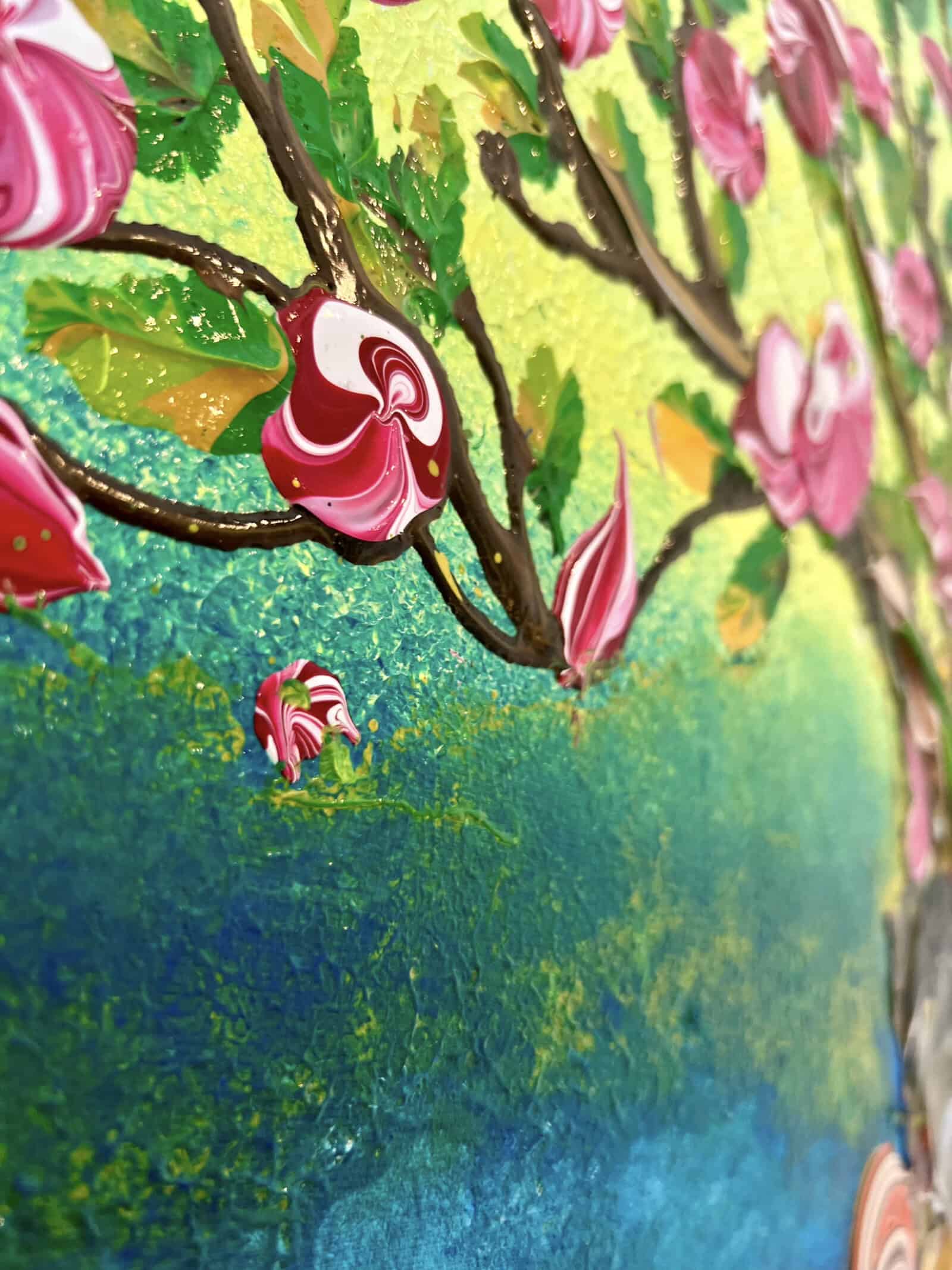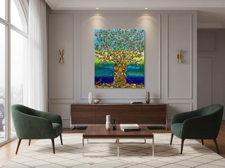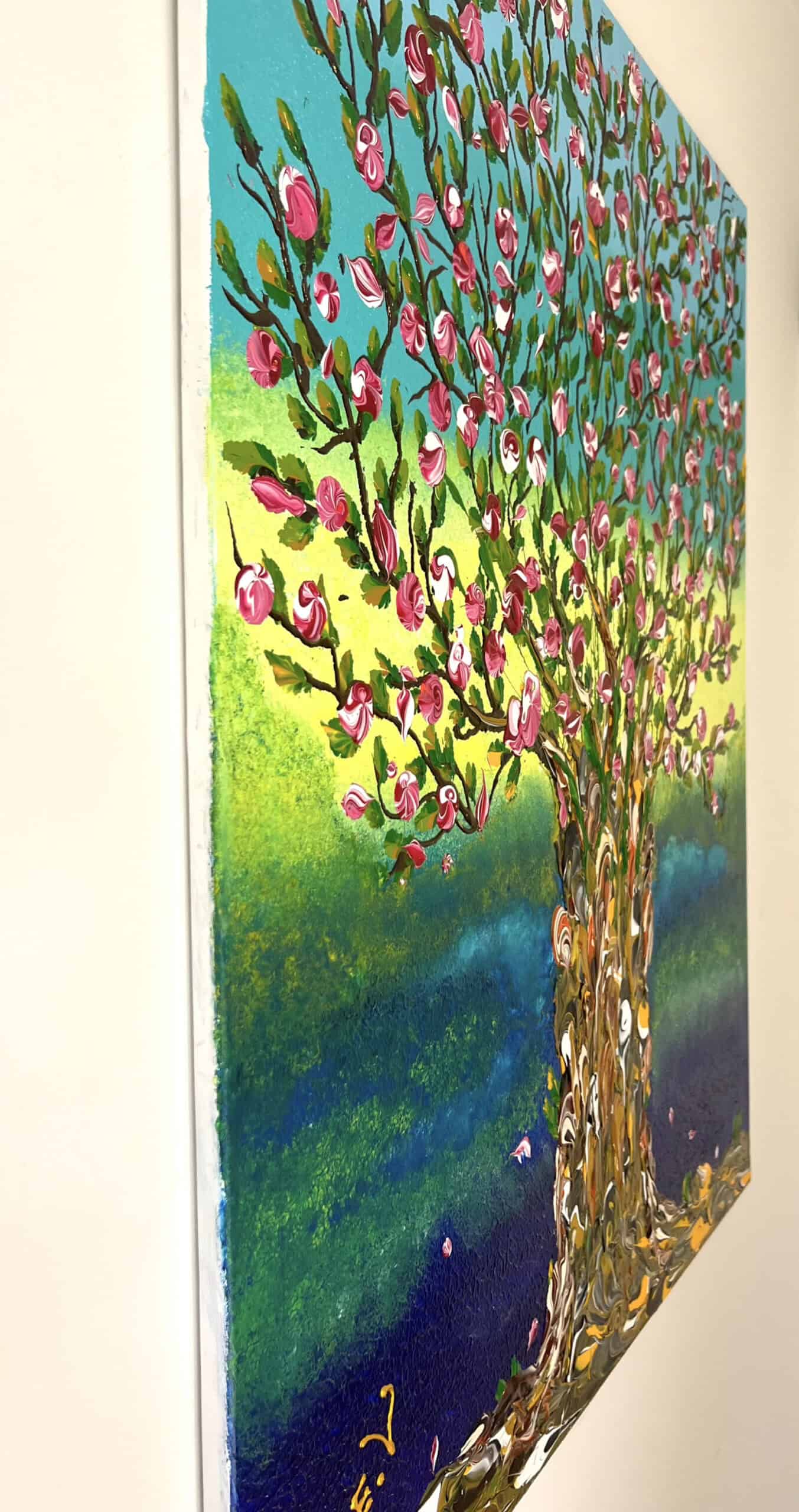 A tree filled with deep pink blossoms and fresh green leaves rises from a richly textured golden trunk. Behind it, a vibrant backdrop shifts from bright yellow-green to deep blue, creating a sense of depth and contrast. The lively colors and falling petals give the painting energy and movement, celebrating the vitality of life.